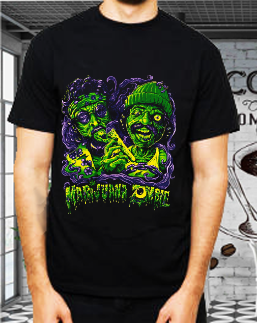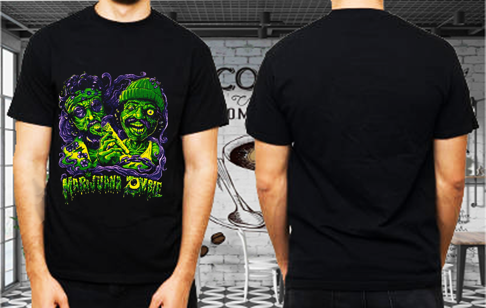The custom DTF print on the shirt features a vibrant and detailed design on front with the marijuana zombie logo The DTF printing process ensures that the design is durable and long-lasting, with a soft-to-the-touch finish that won't crack or fade easily.