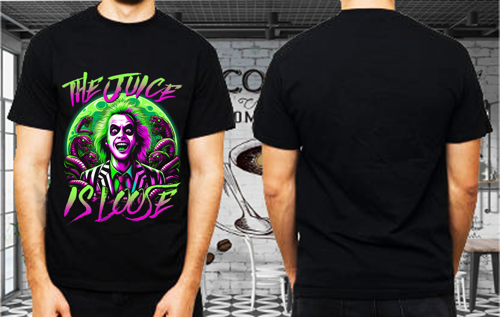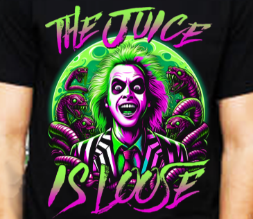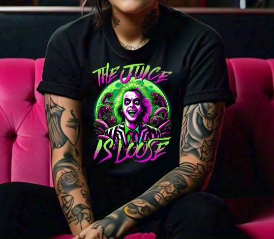 The custom DTF print on the shirt features a vibrant and detailed design with Beetle Juice and "the Juice is loose" text on front of shirt image. The DTF printing process ensures that the design is durable and long-lasting, with a soft-to-the-touch finish that won't crack or fade easily.