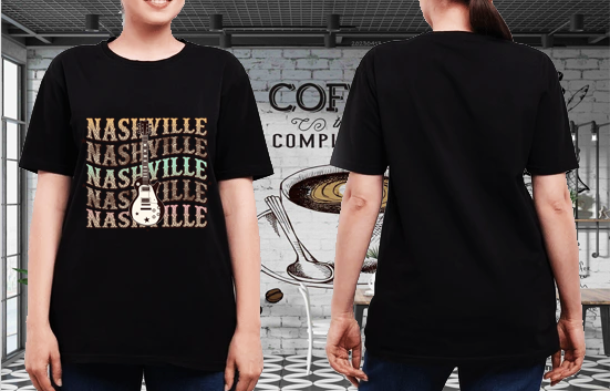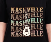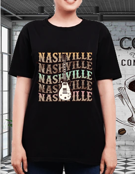 The custom DTF print on the shirt features a vibrant and detailed design with Nashville and guitar t shirt. The DTF printing process ensures that the design is durable and long-lasting, with a soft-to-the-touch finish that won't crack or fade easily.